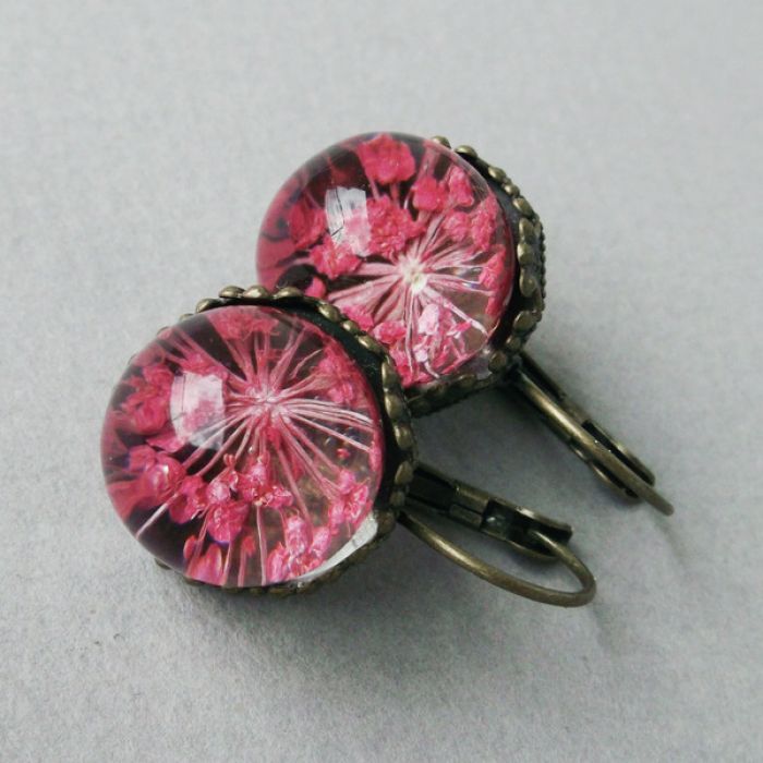 Ozdobne AUTORSKIE kolczyki wykonane z prawdziwych kwiatów na zawsze zatopionych w żywicy. Oprawa kolczyków ma kolor starego złota.