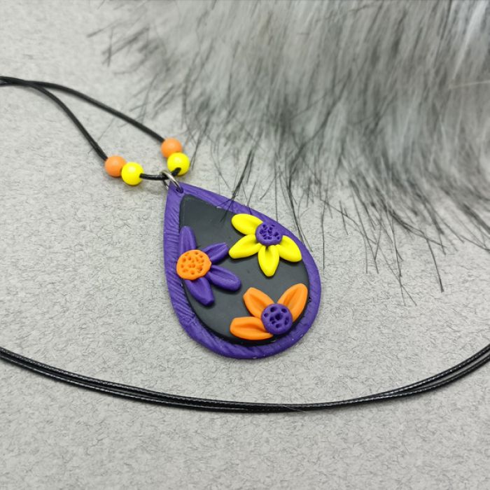 Wisiorek jest w kolorze czarnym i fioletowym z dodatkiem żółtego i pomarańczowego, zawieszony na sznurku jubilerskim.
