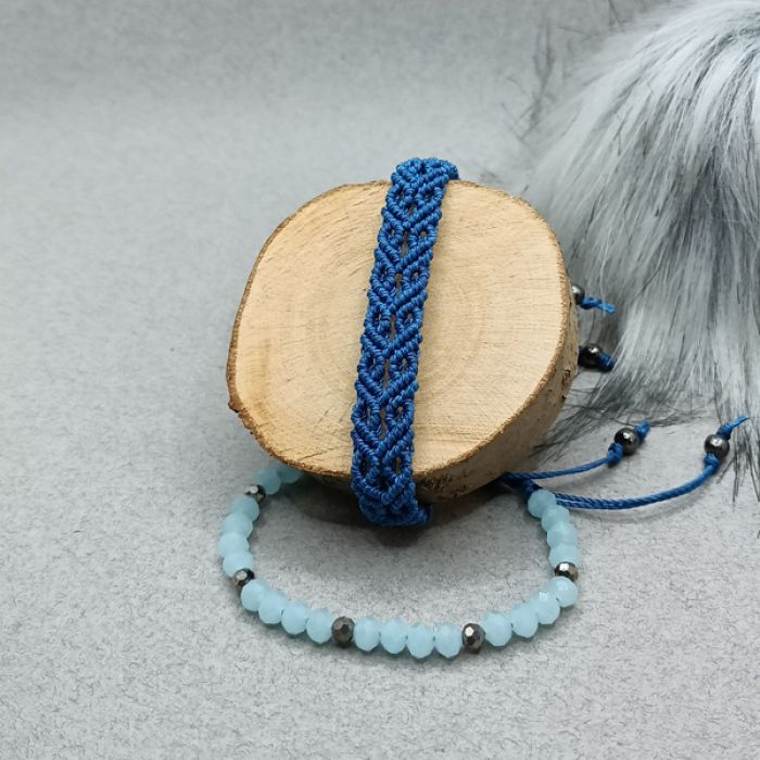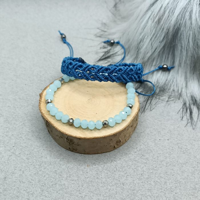 Komplet składa się z dwóch bransoletek. Jedna została wykonana metodą makramową w kolorze granatowym. Druga wykonana z fasetowanych szklanych koralików w kolorze błękitnym z dodatkiem hematytu. Są uniwersalne, można nosić do każdej stylizacji, razem lub oddzielnie, ewentualnie łączyć z innymi bransoletkami. Makramowa bransoletka ma szerokość 1,5 cm. Obie mają regulowany obwód i zapięcie makramowe. Biżuteria jest wysyłana w ozdobnym pudełku.