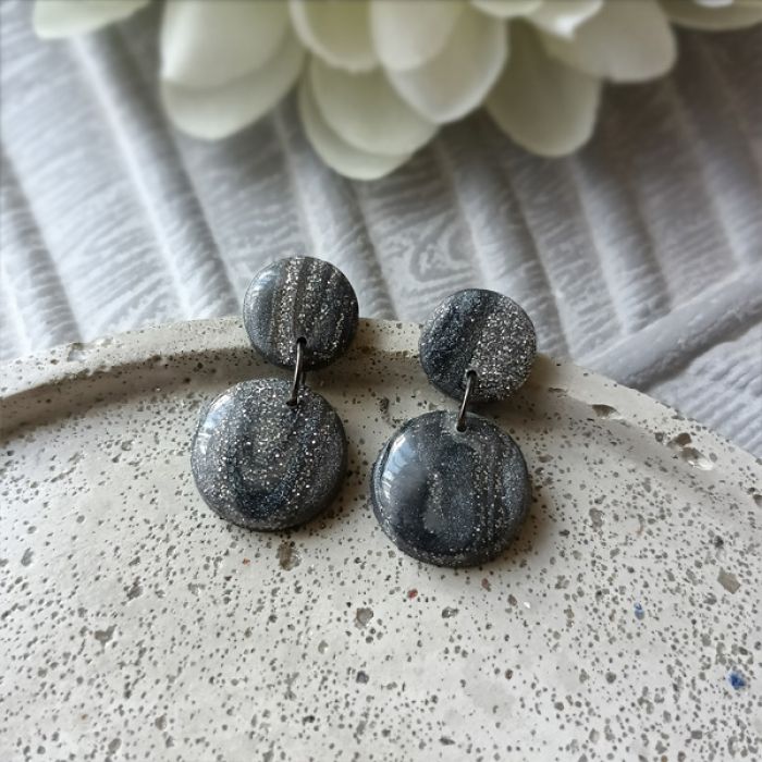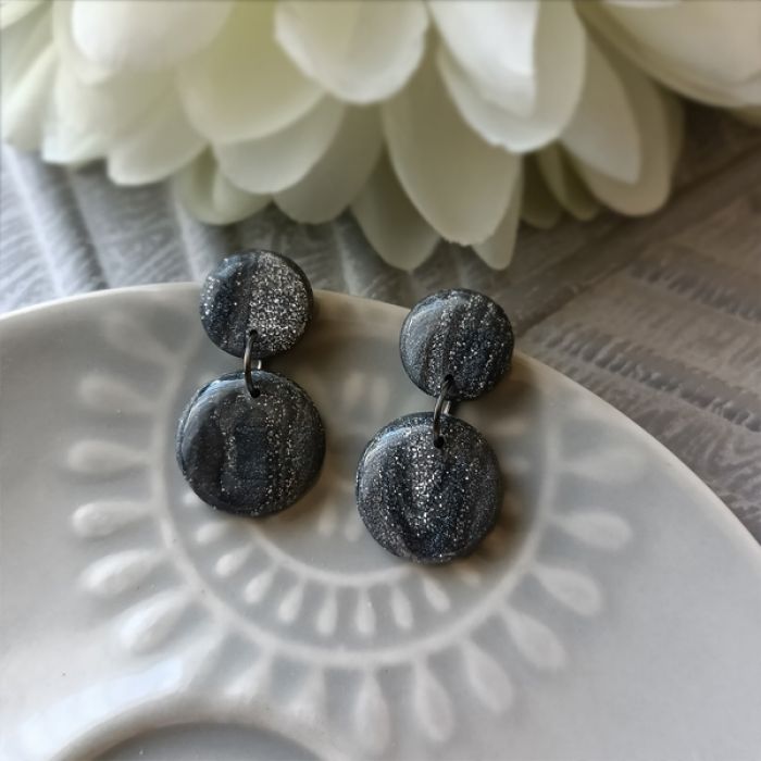 Kolczyki zostały wykonane w całości ręcznie z wysokiej jakości glinki polimerowej. Jest to materiał bardzo trwały, lekki i odporny na wszelkiego rodzaju czynniki zewnętrzne. Kolczyki są w kolorze szarym z drobinkami brokatu, zawieszone na sztyftach. Zostały pokryte żywicą epoksydową dla nadania błyszczącego efektu. Elementy metalowe są ze stali chirurgicznej. Całkowita długość kolczyków 2,8 cm, szerokość 1,8 cm. Są bardzo lekkie i pasują do każdej stylizacji na każdą porę dnia. Biżuteria pakowana jest w ozdobne pudełko. W innej ofercie dostępna jest zawieszka do kompletu.