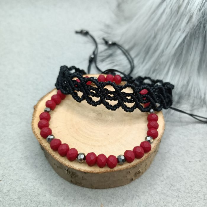 Komplet składa się z dwóch bransoletek. Jedna została wykonana metodą makramową w kolorze czarnym. Druga wykonana z matowych, fasetowanych szklanych koralików w kolorze bordowym z dodatkiem hematytu. Są uniwersalne, można nosić do każdej stylizacji, razem lub oddzielnie, ewentualnie łączyć z innymi bransoletkami. Makramowa bransoletka ma szerokość 1,5 cm. Obie mają regulowany obwód i zapięcie makramowe. Biżuteria jest wysyłana w ozdobnym pudełku.