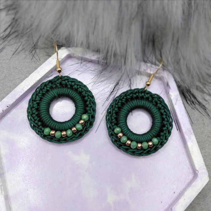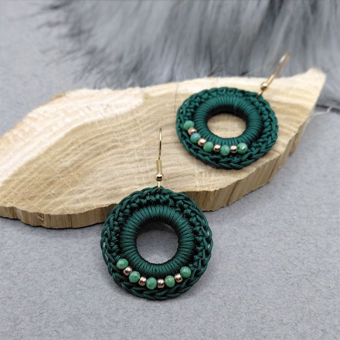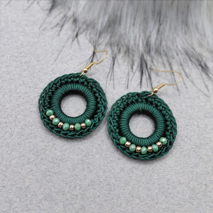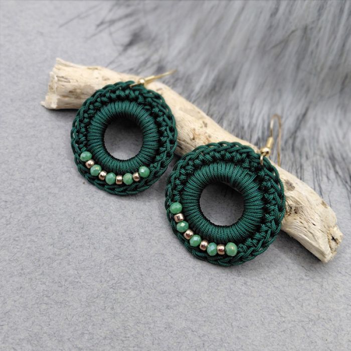 Kolczyki zostały ręcznie wykonane metodą szydełkową z cienkiego sznurka o wysokiej jakości. Materiał ten jest trwały, nie zmienia koloru pod wpływem czynników zewnętrznych oraz nie odkształca się pod wpływem noszenia. Kolczyki są w kolorze butelkowej zieleni z naszytymi drobnymi szklanymi koralikami. Bigle ze stali chirurgicznej w kolorze złotym. Całkowita długość kolczyków 5 cm, średnica 3,5 cm (średnica środka 1,3 cm). Są bardzo lekkie i pasują do każdej stylizacji na każdą porę dnia. Biżuteria pakowana jest w ozdobne pudełk