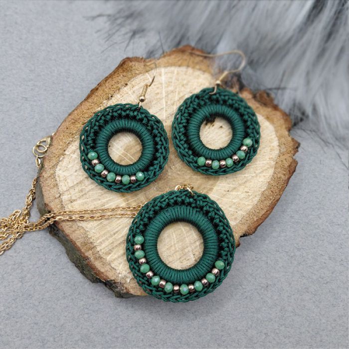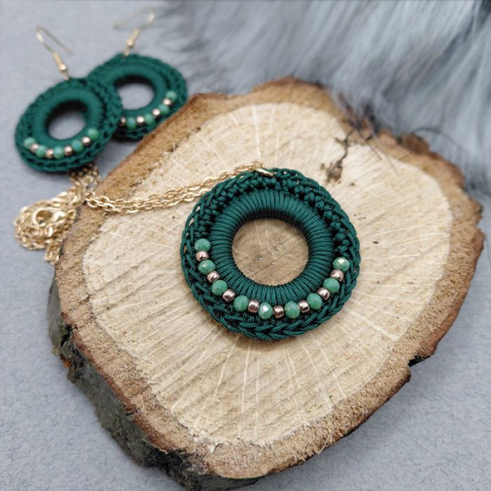 Komplet składa się z kolczyków i wisiorka. Został ręcznie wykonany metodą szydełkową z cienkiego sznurka o wysokiej jakości. Materiał ten jest trwały, nie zmienia koloru pod wpływem czynników zewnętrznych oraz nie odkształca się pod wpływem noszenia. Komplet jest w kolorze butelkowej zieleni z naszytymi drobnymi szklanymi koralikami. Bigle ze stali chirurgicznej w kolorze złotym. Całkowita długość kolczyków 5 cm, średnica 3,5 cm (średnica środka 1,3 cm). Wisiorek zawieszony na łańcuszku ze stali chirurgicznej w kolorze złotym o długości 55 cm. Całkowita długość wisiorka 31 cm, średnica 4,5 cm (średnica środka 1,8 cm). Komplet pasuje do każdej stylizacji na każdą porę dnia. Biżuteria pakowana jest w ozdobne pudełko.