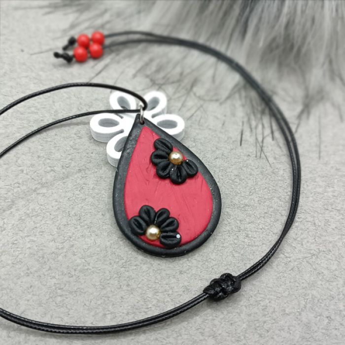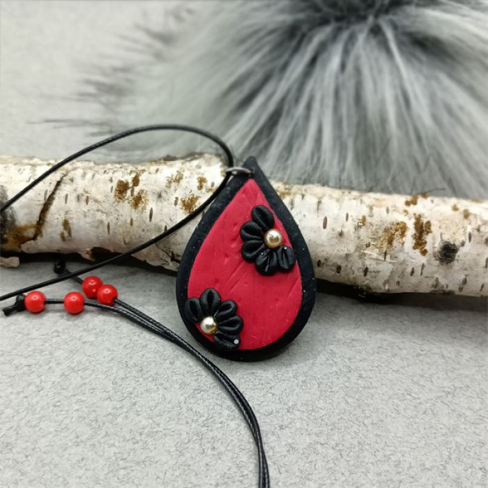 Wisiorek jest w kolorze czarnym i czerwonym, zawieszony na sznurku jubilerskim.