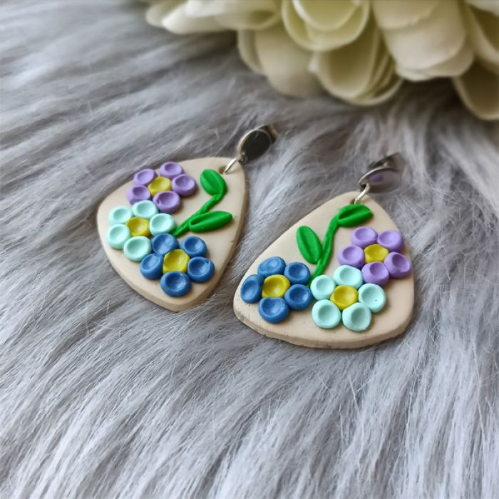 Kolczyki zostały wykonane w całości ręcznie z wysokiej jakości glinki polimerowej. Jest to materiał bardzo trwały, lekki i odporny na wszelkiego rodzaju czynniki zewnętrzne. Kolczyki są zawieszone na sztyftach ze stali chirurgicznej. Długość kolczyka z biglem 4 cm, szerokość 2,8 cm. Są bardzo lekkie i pasują do każdej stylizacji na każdą porę dnia. Biżuteria pakowana jest w ozdobne pudełko.