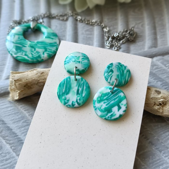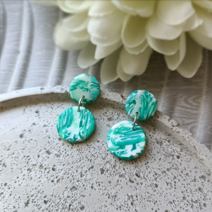 Kolczyki zostały wykonane w całości ręcznie z wysokiej jakości glinki polimerowej. Jest to materiał bardzo trwały, lekki i odporny na wszelkiego rodzaju czynniki zewnętrzne. Kolczyki są w różnych odcieniach zieleni, zawieszone na sztyftach. Górna część kolczyków została pokryta żywicą epoksydową dla nadania błyszczącego efektu, dolna część jest matowa. Elementy metalowe są ze stali chirurgicznej. Całkowita długość kolczyków 3 cm, szerokość 1,8 cm. Są bardzo lekkie i pasują do każdej stylizacji na każdą porę dnia. Biżuteria pakowana jest w ozdobne pudełko. W innej ofercie dostępna jest zawieszka do kompletu.