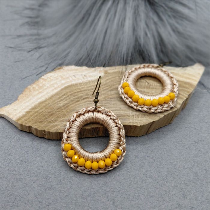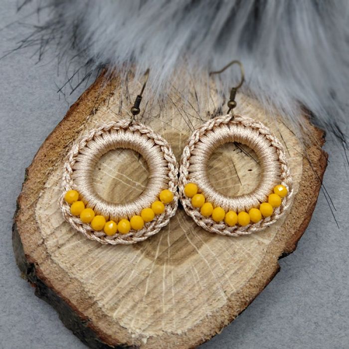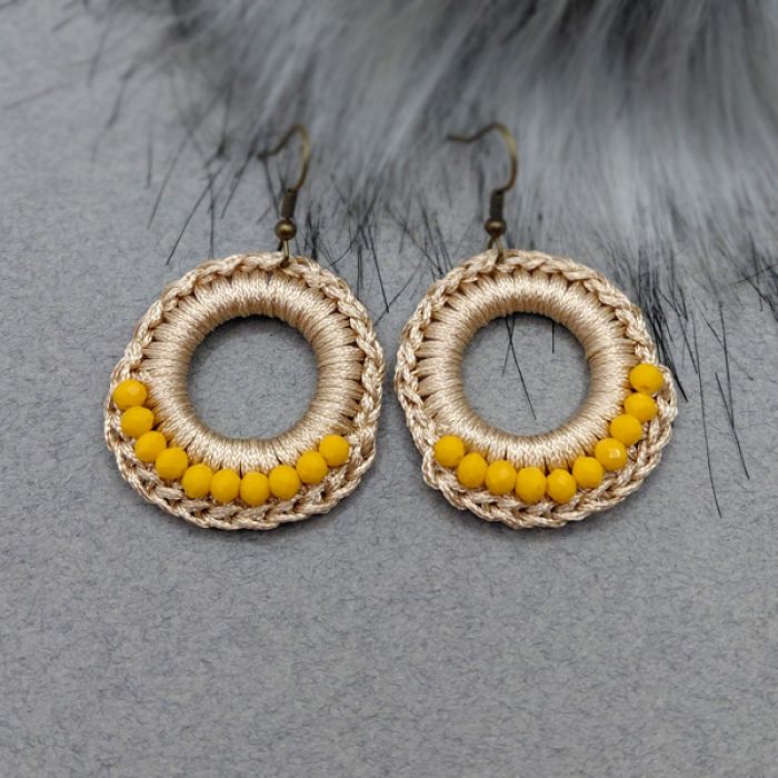 Kolczyki zostały ręcznie wykonane metodą szydełkową z cienkiego sznurka o wysokiej jakości. Materiał ten jest trwały, nie zmienia koloru pod wpływem czynników zewnętrznych oraz nie odkształca się pod wpływem noszenia. Kolczyki są w kolorze beżowym z naszytymi drobnymi szklanymi koralikami. Bigle ze stali chirurgicznej w kolorze oliwkowym. Całkowita długość kolczyków 5,5 cm, średnica 3,5 cm (średnica środka 1,8 cm). Są bardzo lekkie i pasują do każdej stylizacji na każdą porę dnia. Biżuteria pakowana jest w ozdobne pudełko.