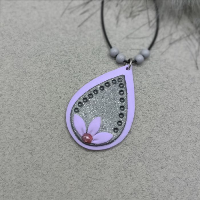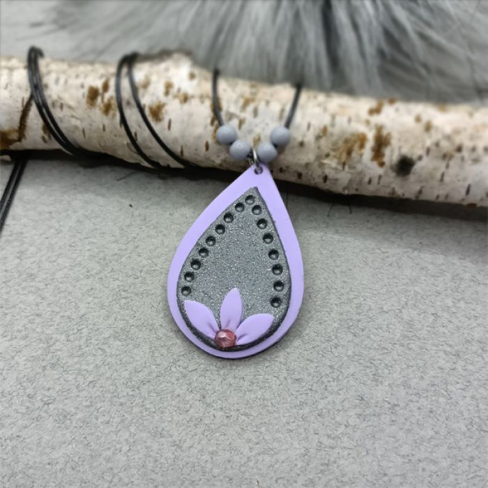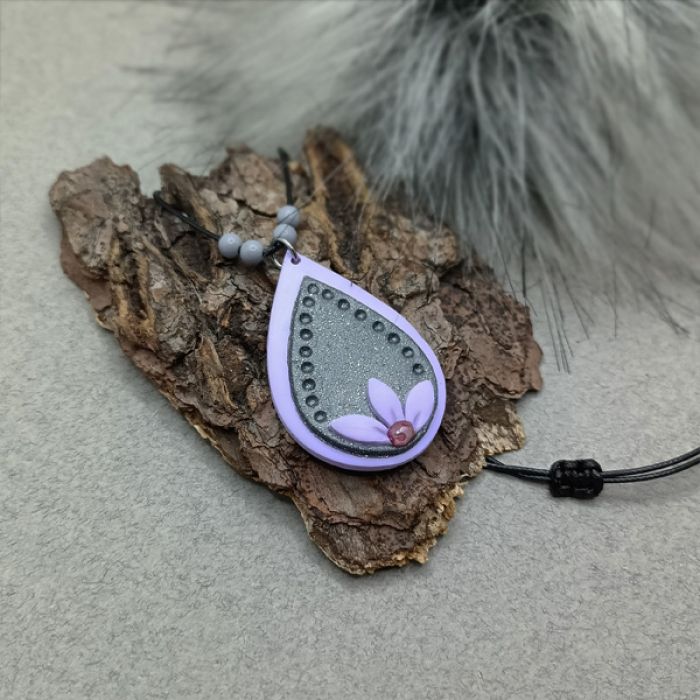 Wisiorek jest w kolorze szarym i modnym lawendowym, zawieszony na sznurku jubilerskim.