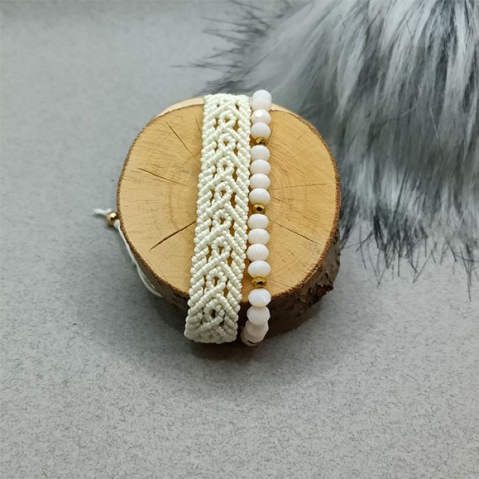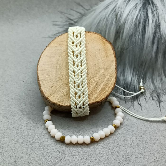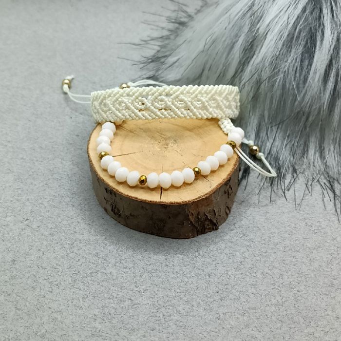 Komplet składa się z dwóch bransoletek w kolorze ecru. Jedna została wykonana metodą makramową, druga wykonana jest z fasetowanych szklanych koralików z dodatkiem hematytu w kolorze złotym. Są uniwersalne, można nosić do każdej stylizacji, razem lub oddzielnie, ewentualnie łączyć z innymi bransoletkami. Makramowa bransoletka ma szerokość 1,5 cm. Obie mają regulowany obwód i zapięcie makramowe z kulkami ze stali chirurgicznej na końcu. Biżuteria jest wysyłana w ozdobnym pudełku.