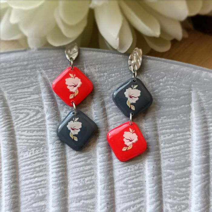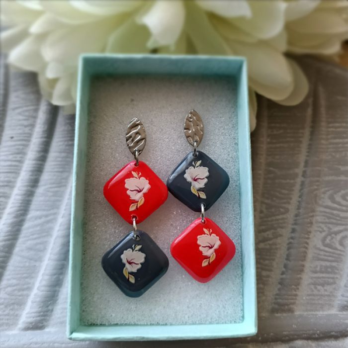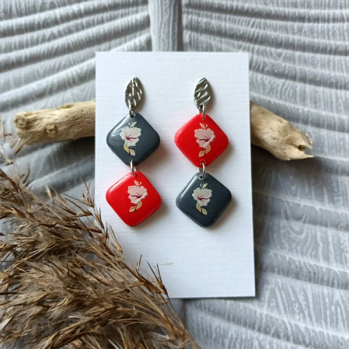 Kolczyki zostały wykonane w całości ręcznie z wysokiej jakości glinki polimerowej. Jest to materiał bardzo trwały, lekki i odporny na wszelkiego rodzaju czynniki zewnętrzne. Kolczyki są w kolorze szarym i czerwonym z delikatnym ornamentem, pokryte żywicą epoksydową dla nadania błyszczącego efektu. Sztyfty i elementy metalowe są ze stali chirurgicznej w kolorze srebrnym. Całkowita długość kolczyków 5,5 cm, szerokość 2 cm. Są bardzo lekkie i pasują do każdej stylizacji na każdą porę dnia. Biżuteria pakowana jest w ozdobne pudełko.