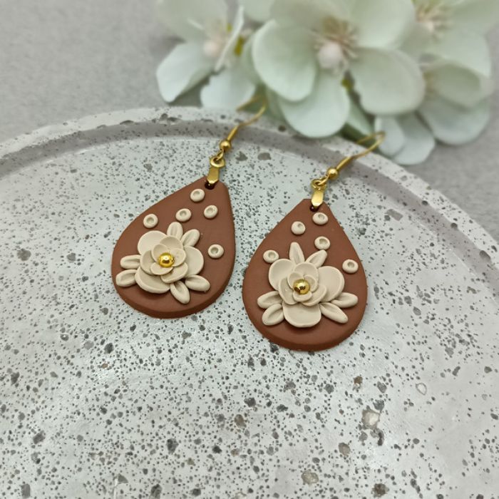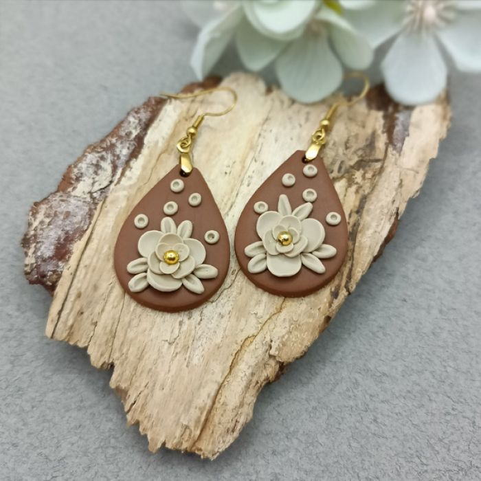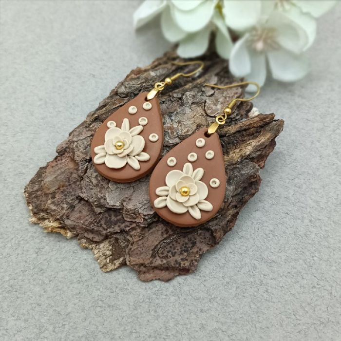 Kolczyki zostały wykonane w całości ręcznie z wysokiej jakości glinki polimerowej. Jest to materiał bardzo trwały, lekki i odporny na wszelkiego rodzaju czynniki zewnętrzne. Kolczyki są w kolorze jasnego brązu i beżu, zawieszone na sztyftach ze stali chirurgicznej w kolorze złotym. Długość kolczyka z biglem 6 cm, szerokość 2,5 cm. Są bardzo lekkie i pasują do każdej stylizacji na każdą porę dnia. Biżuteria pakowana jest w ozdobne pudełko.