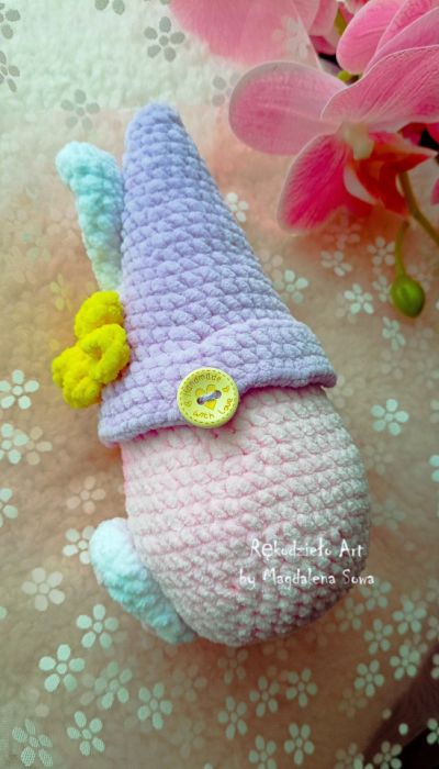 Gnom na zdjęciach w kolorach: jasny róż + biel + jasny fiolet + żółty + jasny brąz (nosek) + róż (guziczki)