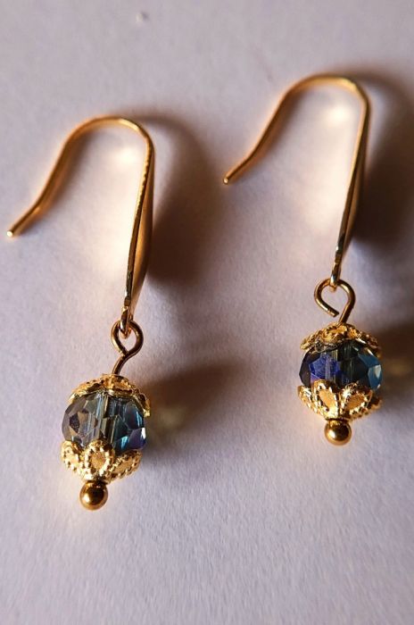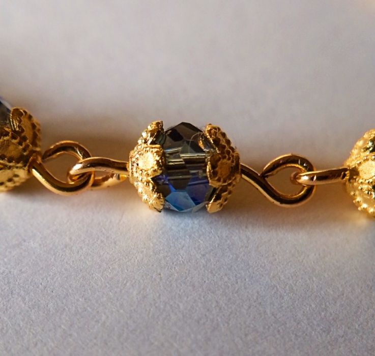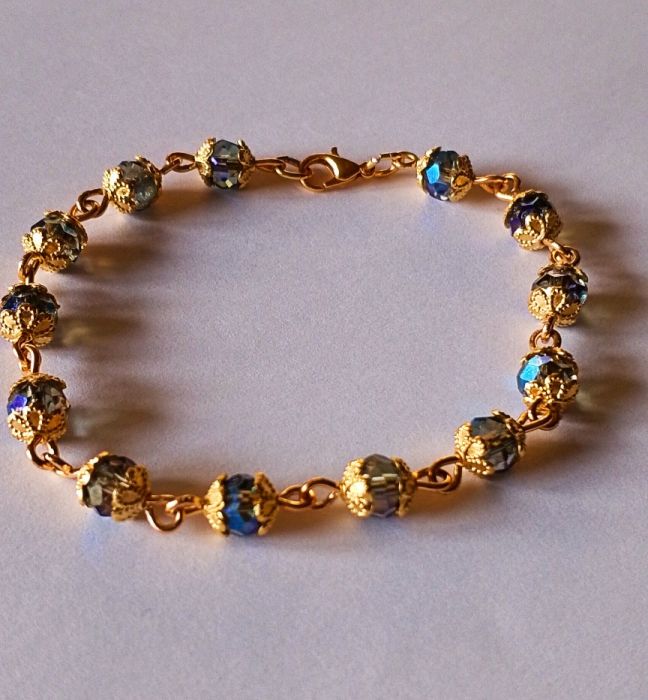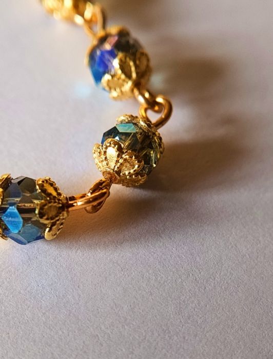 Unikatowy komplet składający się z bransoletki i kolczyków . Koraliki to kryształ austriacki umieszczony w dekoracyjnych listkach . Całość umieszczona na pozłacanym drucie miedzianym.