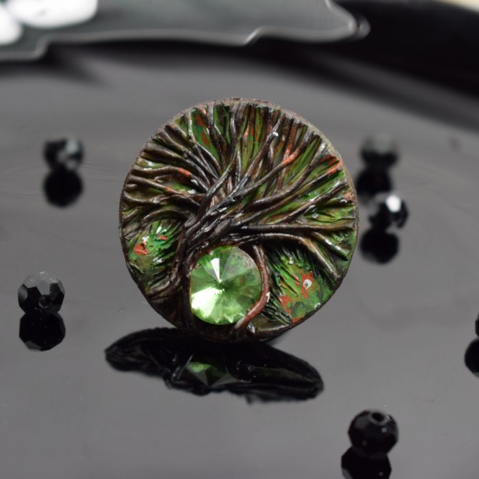 Ozdobny element z drzewem ma średnicę 3 cm. Wykonałam go ręcznie z glinki polimerowej. Jest to materiał trwały, lekki i odporny na uszkodzenia.