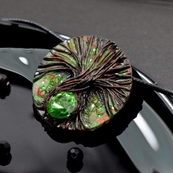 Ozdobny element z drzewem ma średnicę 4 cm. Wykonałam go ręcznie z glinki polimerowej. Jest to materiał trwały, lekki i odporny na uszkodzenia.