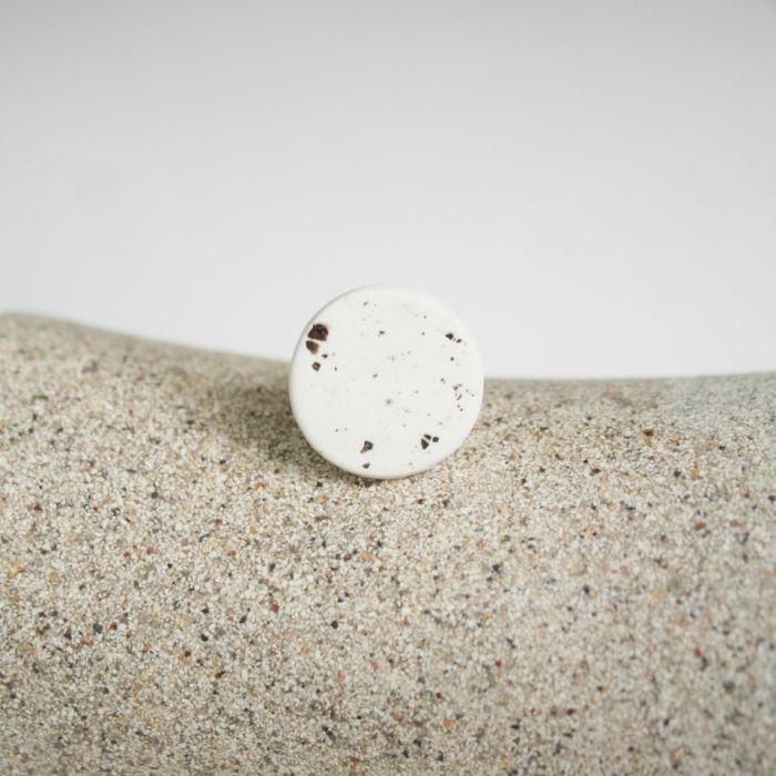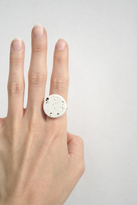 Unikatowy, ręcznie wykonany pierścionek charakteryzujący się prostą, okrągłą formą, w której zatopiono pieprz.
