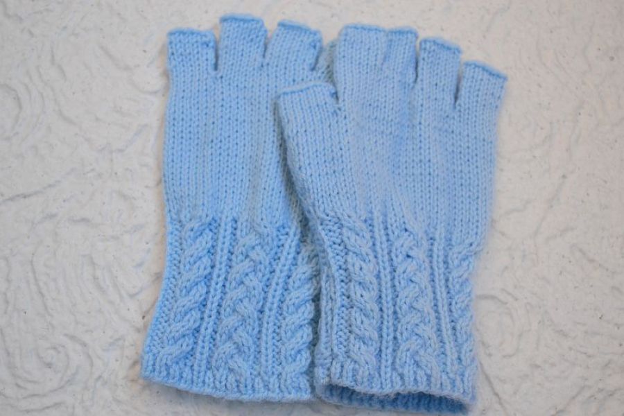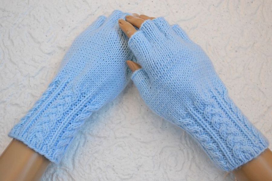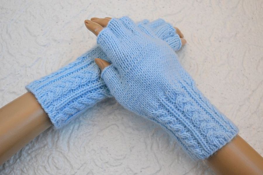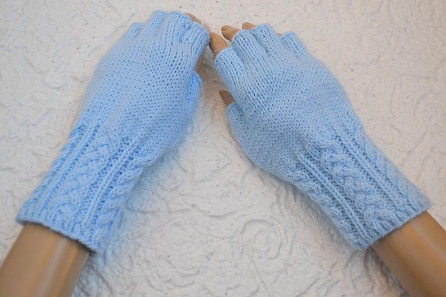 Mitenki wykonane z włoczki o składzie 80% akryl, 20% wełna w kolorze jasny niebieski ;)