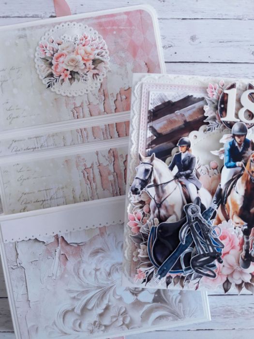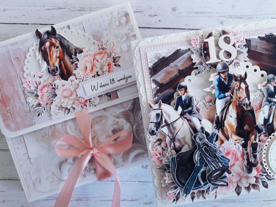 Warstwowa kartka na 18-tkę dla miłośniczki koni z efektem 3D, wykonana metodą scrapbookingu.