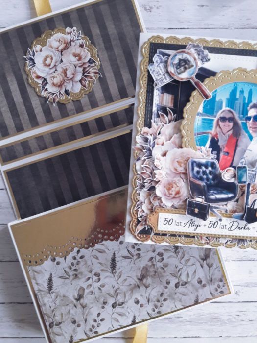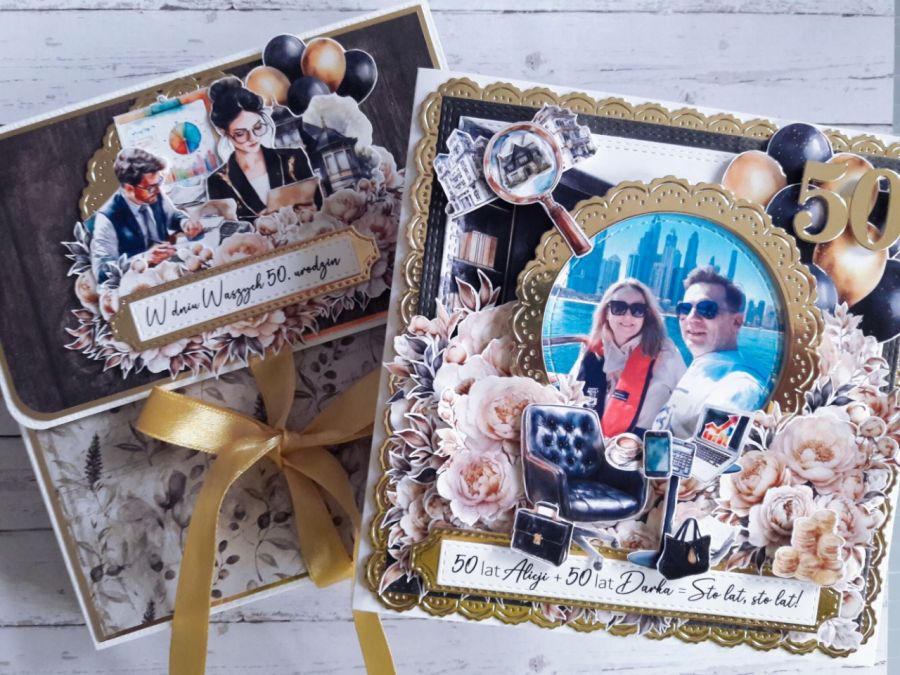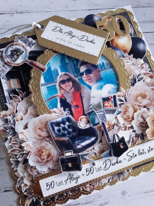 Warstwowa kartka na podwójne 50. urodziny z efektem 3D, wykonana metodą scrapbookingu.