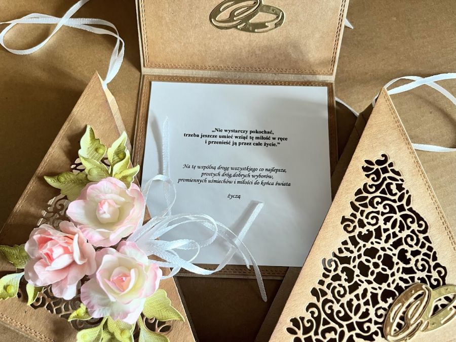 Elegancka, bogato zdobiona kartka w pudełku z okazji ślubu. Utrzymana w kraftowej kolorystyce - ozdobiona kwiatami w kolorze kremu. Na kartce dodano złote serduszka . Kartka jest w całości wykonana ręcznie z najlepszej jakości materiałów do scrapbookingu tak jak pudełko tz. sandwich box. Wielkość pudełka 14,5x14,5x3. Wielkość kartki 14 x 14 wewnątrz ,której są gotowe życzenia do własnoręcznego podpisu oraz kieszonka na małe co nieco lub kupon lotto.Torebka też jest eco utrzymana w tej samej stylizacji co kartka i pudełko.Wielkość torebki 18x21x8 Zestaw dostępny od ręki. Polecam
