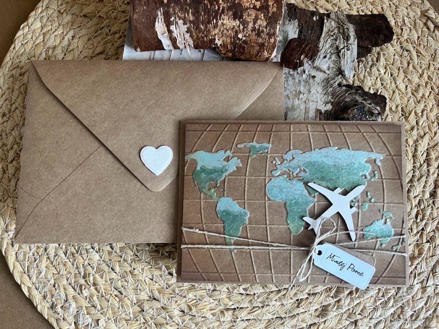 Kartka z okazji Ślubu z dopasowaną stylistycznie kopercie dla Młodej Pary , która kocha podróże i wybiera się w szczęśliwą podróż przez wspólne życie z urokliwym samolotem. Komplet stworzony na bazie papieru kraftowego nadając kompletowi klimat eco. Mapa świata na siatce wypełniona jest metalicznymi akwarelami, które są poddane blendowaniu. Kartka ma wymiary 14,5 x 10,5 a koperta 12,5 x 17,0..W środku kartki znajdują się gotowe życzenia do własnoręcznego podpisu oraz umieszczono kieszonkę na małe co nieco( kilka banknotów) lub kupon lotto , W tej postaci produkt dostępny od ręki .