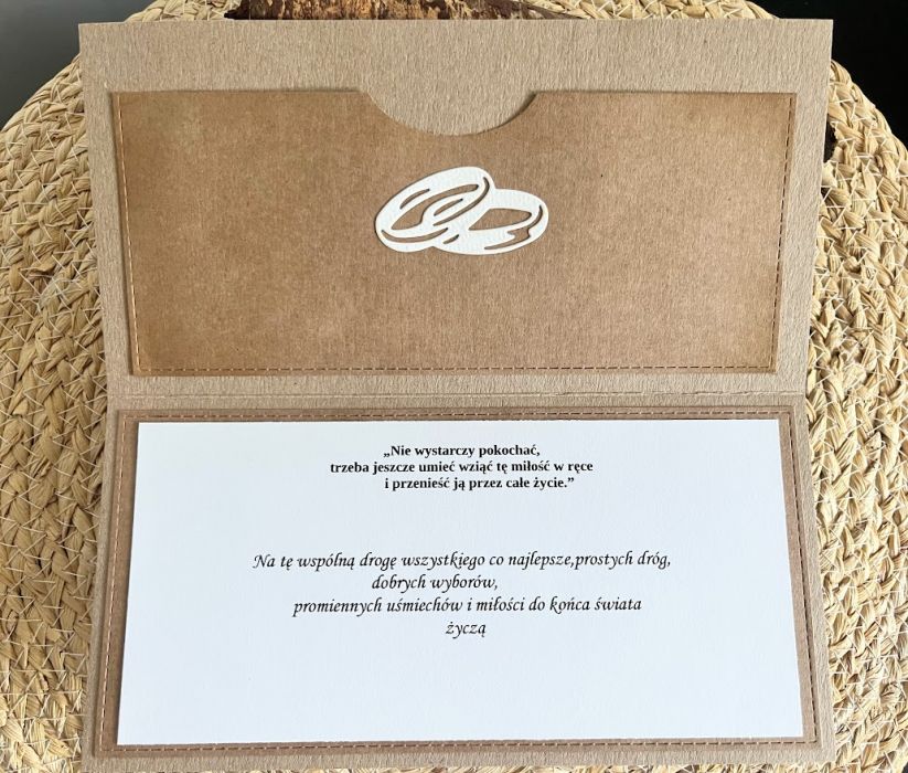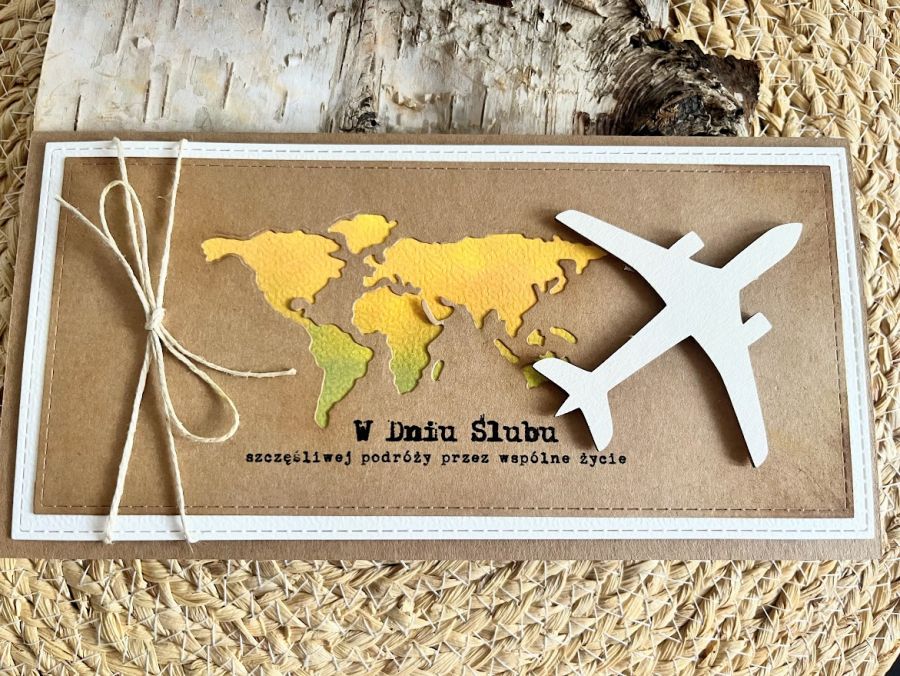 Kartka z okazji Ślubu do koperty dla Młodej Pary , która kocha podróże i wybiera się w szczęśliwą podróż przez wspólne życie z urokliwymsamolotem. Komplet stworzony na bazie papieru kraftowego nadając kompletowi klimat eco. Kartka ma wymiary 21 x 10,5 , koperta ma wymiary 22 x 11. Całość obwiązana sznurkiem z tagiem – biletem .W środku kartki znajdują się gotowe życzenia do własnoręcznego podpisu oraz umieszczono kieszonkę na małe co nieco lub kupon lotto W tej postaci produkt dostępny od ręki .