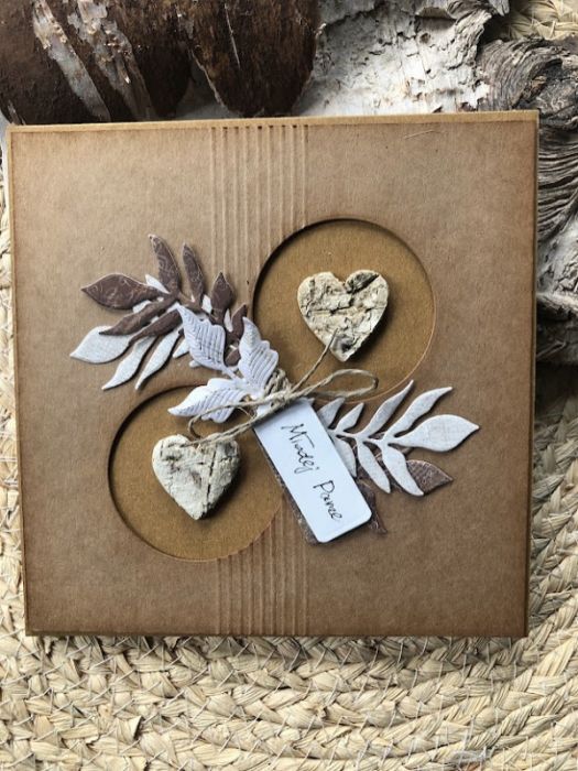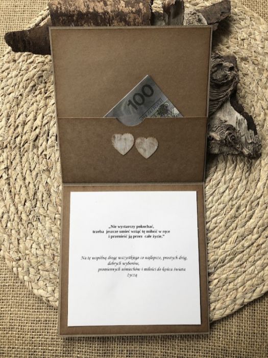 Kartka na ślub w stylu eco. Wykonana ręcznie z niezwykłą starannością i dbałością o każdy detal. Powstała z materiałów do scrapbookingu .Baza w kolorze kraftowym. Zdobiona brzozowymi serduszkami. Rozmiar 15*15 cm. W komplecie z kopertą w podobnej stylizacji i obwiązana sznurkiem. Wewnątrz znajdują się gotowe życzenia oraz kieszonka na małe co nieco .W tej postaci kartka dostępna od ręki. Polecam