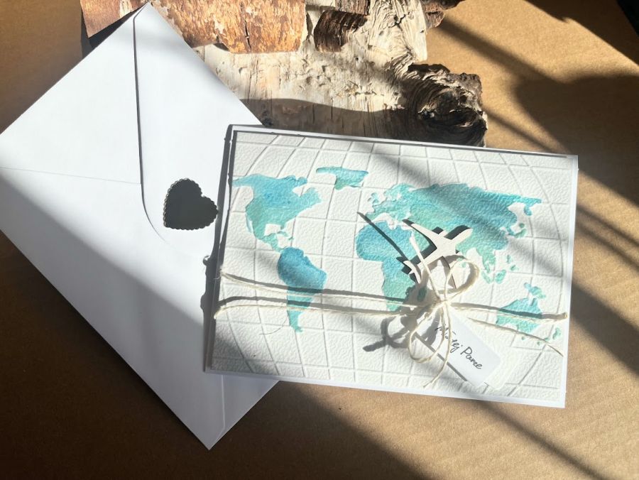 Kartka z okazji Ślubu do koperty dla Młodej Pary , która kocha podróże i wybiera się w szczęśliwą podróż przez wspólne życie z urokliwym samolotem, Komplet stworzony z białego papieru. Kartka ma wymiary 14,5x 10,5 , koperta ma wymiary 15,5 x 11. Całość obwiązana sznurkiem z tagiem – biletem .W środku kartki znajduje sie gotowe życzenia do własnoręcznego podpisu oraz umieszczono kieszonkę na małe co nieco lub kupon lotto W tej postaci produkt dostępny od ręki .