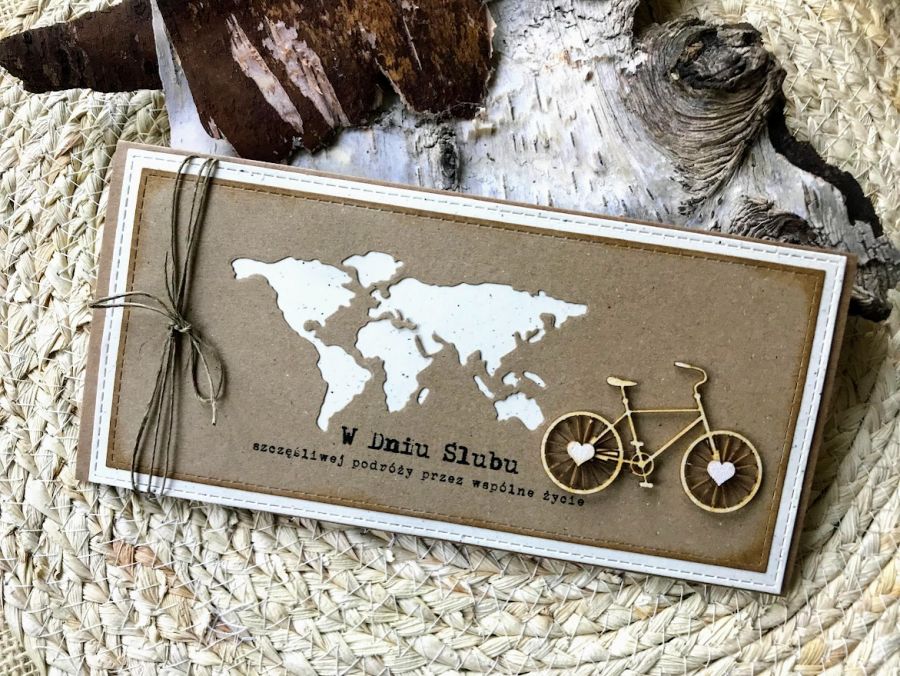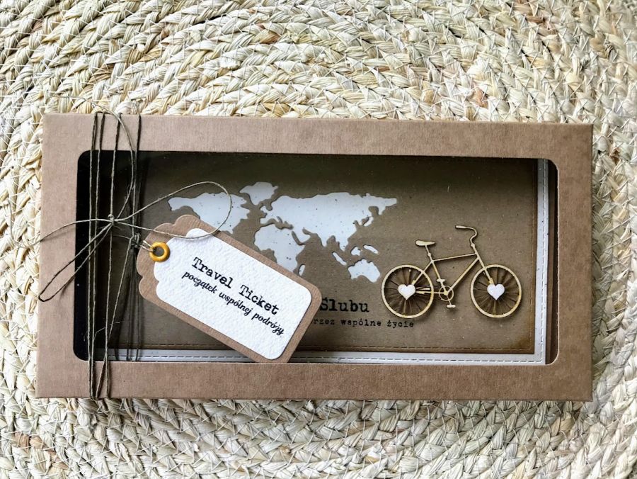 Kartka z okazji Ślubu w dopasowanym stylistycznie pudełku z okienkiem dla Młodej Pary , która kocha podróże i wybiera się w szczęśliwą podróż przez wspólne życie z urokliwym rowerkiem. Komplet stworzony na bazie papieru kraftowego nadając kompletowi klimat w stylu rustykalnym. Kartka ma wymiary 21,0 x 10,5 , pudełko ma wymiary 11,5 x 22,5. Całość obwiązana sznurkiem z tagiem - biletem .W środku kartki znajduje się miejsce na wypisanie własnych życzeń a na dnie pudełka umieszczono kieszonkę na małe co nieco. W tej postaci produkt dostępny od ręki .