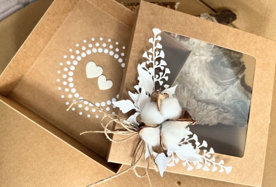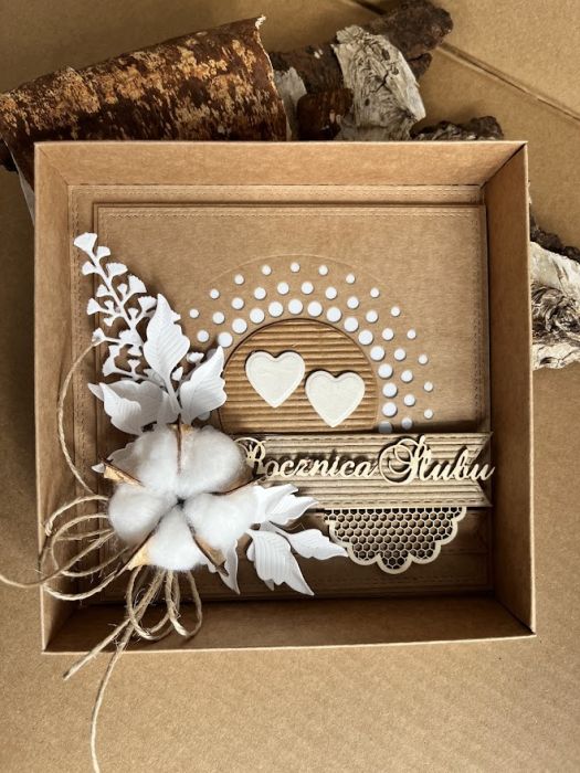 Kartka z okazji rocznicy ślubu. Wykonana ręcznie z niezwykłą starannością i dbałością o każdy detal. Na bazie z papieru kraftowego, w naturalnej kremowo - brązowej kolorystyce. z naturalną kwiatową kompozycją kwiatu bawełny. piękną ażurową bazą. Rozmiar ok 14,0 x 14,0 cm. Wewnątrz kartki znajduje się karnet na życzenia oraz kieszonka na małe co nieco. W komplecie pudełko z papieru kraftowego (rozmiar 15,5 x 15,5 cm) ozdobione tak jak kartka..W tej postaci komplet dostępny od ręki.