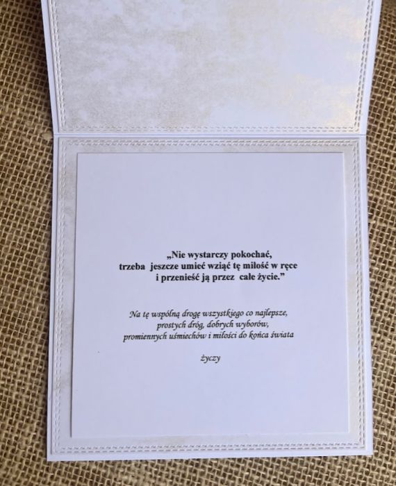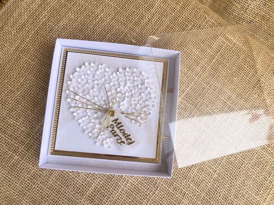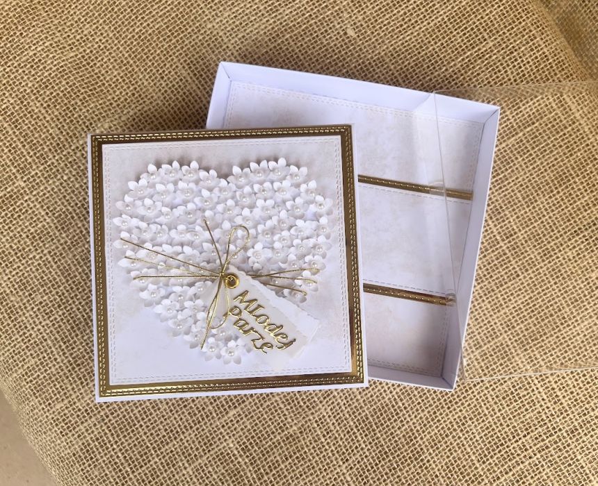 Kartka wykonana metodą scrapbookingu z najwyższej jakości materiałów.Kartka warstwowa z urokliwym sercem stworzonym z kwiatów, ręcznie stworzonych. Wykonane na białej bazie w kolorystyce perłowego złota z dodatkiem lustrzanego złota . Wielkość kartki to 14 x 14 ,a pudełka z transparentnym wieczkiem to 15 x 15. Do kompletu dołączono torebkę ma wym. 21x18x8 w tej samej stylizacji. Wewnątrz pudełka umieszczono kieszonkę na małe co nieco a wewnątrz kartki gotowe życzenia do własnoręcznego podpisu. W tej postaci komplet dostępny od ręki.