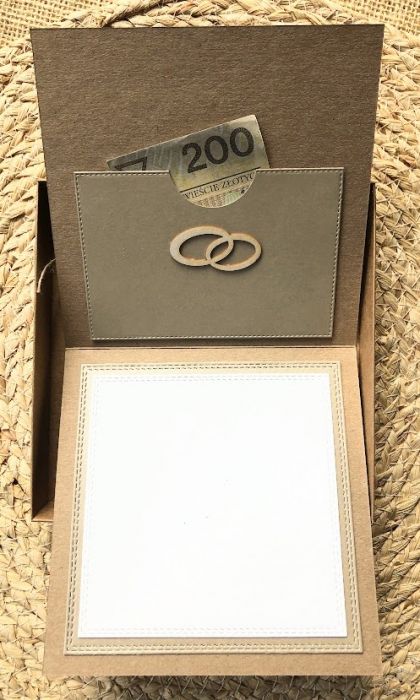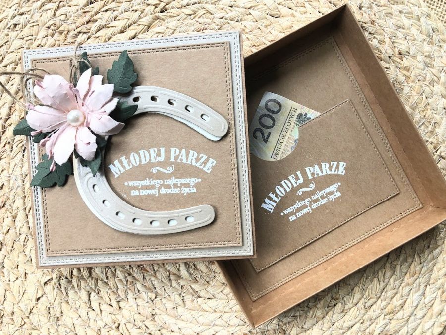 Kartka z okazji Ślubu wykonana ręcznie z niezwykłą starannością i dbałością o każdy detal. Na bazie z papieru kraftowego, w naturalnej platynowo- brązowej kolorystyce. Z kwiatem oraz podkową i napisem . Rozmiar ok 14,0 x 14,0 cm. Wewnątrz kartki znajduje się karnet na wypisanie własnych życzeń oraz kieszonka na małe co nieco .W komplecie pudełko z papieru kraftowego ozdobionym w stylu kartki (rozmiar 15,5 x 15,5 cm). W tej postaci komplet dostępny od ręki.Polecam