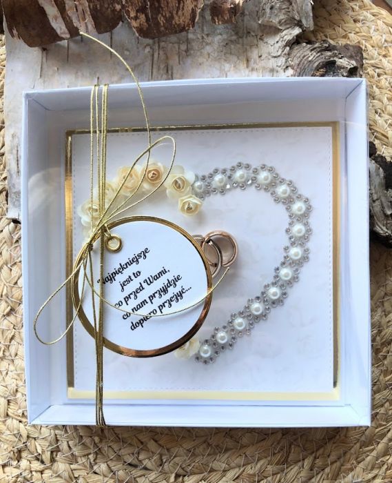 Kartka wykonana metodą scrapbookingu z najwyższej jakości materiałów.Kartka warstwowa z urokliwym sercem stworzonym z kremowych kwiatów,. Wszystko wykonane w białej kolorystyce z dodatkiem metalicznego złota . Wielkość kartki to 13,5 x 13,5 ,a pudełka z transparentnym wieczkiem to 15 x 15. Wewnątrz kartki umieszczono kieszonkę na małe co nieco oraz gotowe życzenia do własnoręcznego podpisu. W tej postaci komplet dostępny od ręki.
