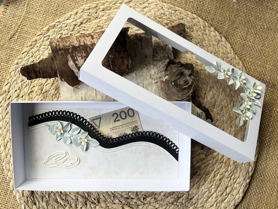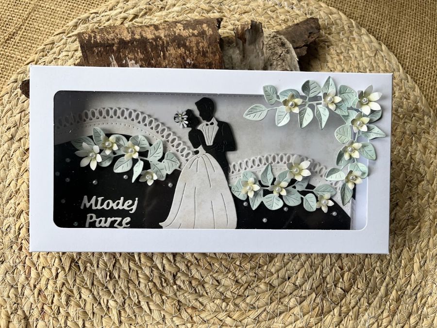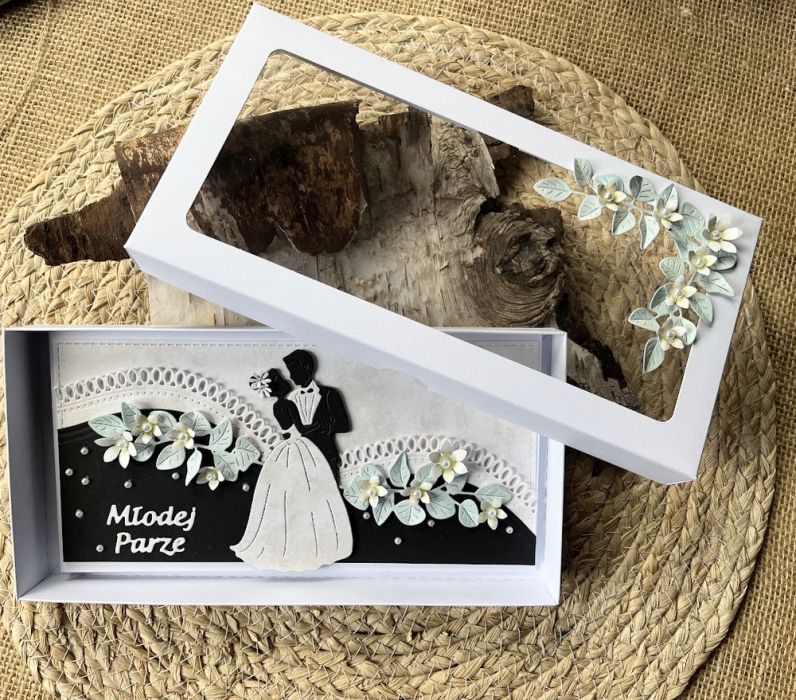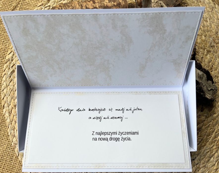 Jeśli szukasz nietuzinkowego dodatku do prezentu ślubnego, dobrze trafiłeś. Ręcznie robione kartki ślubne dla nowożeńców będą dla nich miłą pamiątką na całe życie. Ręcznie tworzone kartki ślubne to unikatowe egzemplarze, których nie znajdziesz w zwykłym sklepie. Tworzone z najwyższą starannością i pasją dają gwarancję wyjątkowości. Kartka ślubna handmade ozdobiona kwiatami, , perełkami oraz dekorami, to wspaniała kompozycja która zachwyci nie tylko parę młodą ale także wszystkich gości. Kartka w stworzona w kolorystyce bieli i czerni oraz delikatnego złota. Wielkość kartki 10,5 x 21. Wielkość pudełka 11,5 x 22,5 ,które przyozdobiono w tej samej stylizacji i na jego dnie umieszczono kieszonkę na małe co nieco. Wewnątrz kartki gotowe życzenia do samodzielnego podpisu.W tej postaci komplet dostępny od ręki.