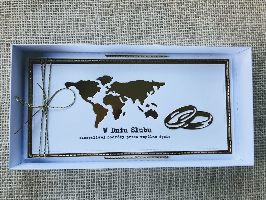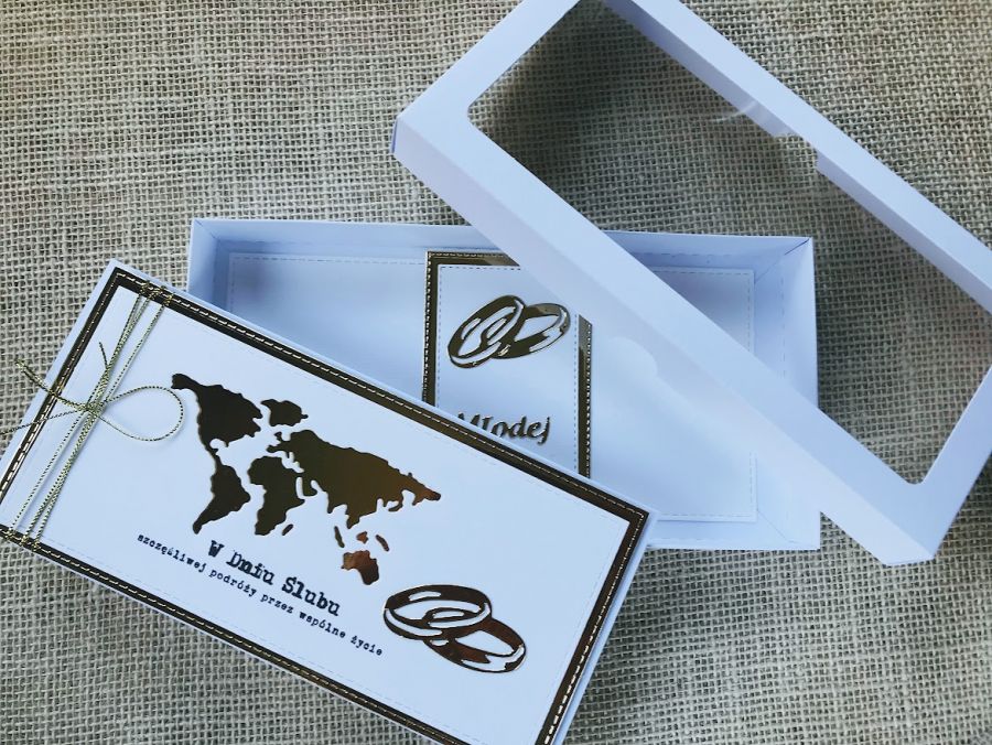 Kartka z okazji Ślubu w dopasowanym stylistycznie pudełku z okienkiem dla Młodej Pary , która kocha podróże i wybiera się w szczęśliwą podróż przez wspólne życie.Komplet stworzony w kolorystyce białej z dodatkiem lustrzanego złota dodając całości subtelnej elegancji.. Kartka ma wymiary 21 x 10,5 , pudełko ma wymiary 11,5 x 22,5. Całość obwiązana sznurkiem z tagiem - biletem .W środku kartki znajduje się miejsce na wypisanie własnych życzeń oraz cytat odpowiedni do uroczystości,a na dnie pudełka umieszczono kieszonkę na małe co nieco lub kupon lotto. W tej postaci produkt dostępny od ręki .