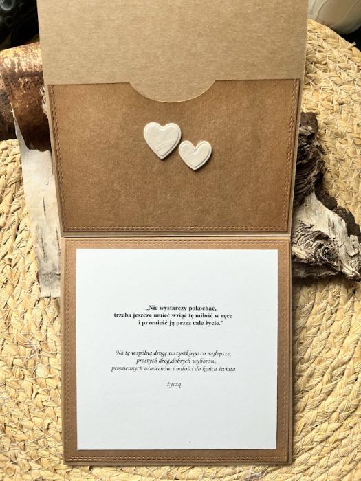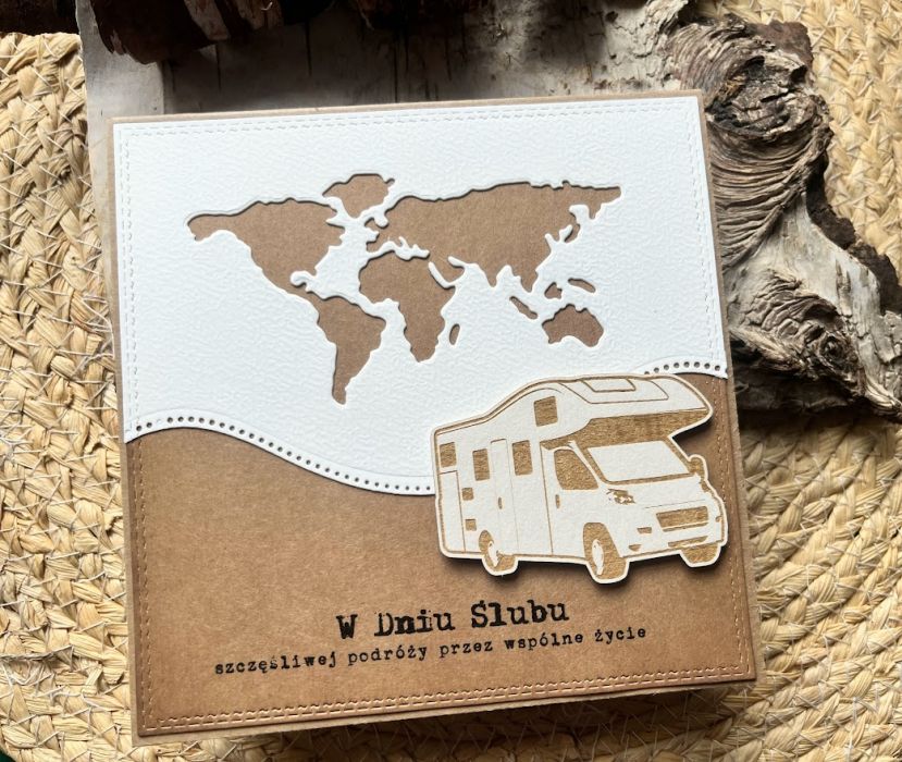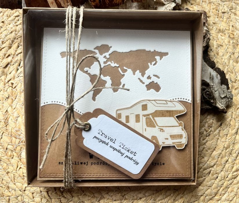 Kartka z okazji Ślubu dla Młodej Pary , która kocha podróże i wybiera się w szczęśliwą podróż przez wspólne życie z urokliwym kamperem. Komplet: pudełkoi kartka stworzona na bazie papieru scrapowego kraftowego, który przełamuje dodatek w kolorze złamanej bieli. Kartka ma wymiary 14 x 14, pudełko ma wymiary 15,5 x 15,5. Całość obwiązana sznurkiem z tagiem - biletem .W środku kartki znajdują się gotowe życzenia do włanoręcznego podpisu oraz umieszczono kieszonkę na małe co nieco lub kupon lotto. W tej postaci produkt dostępny od ręki,