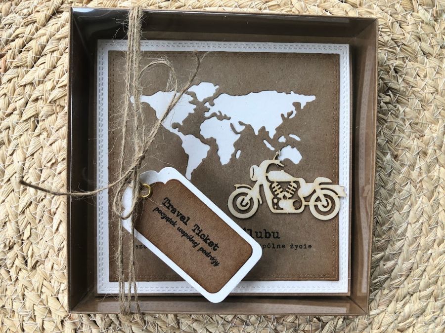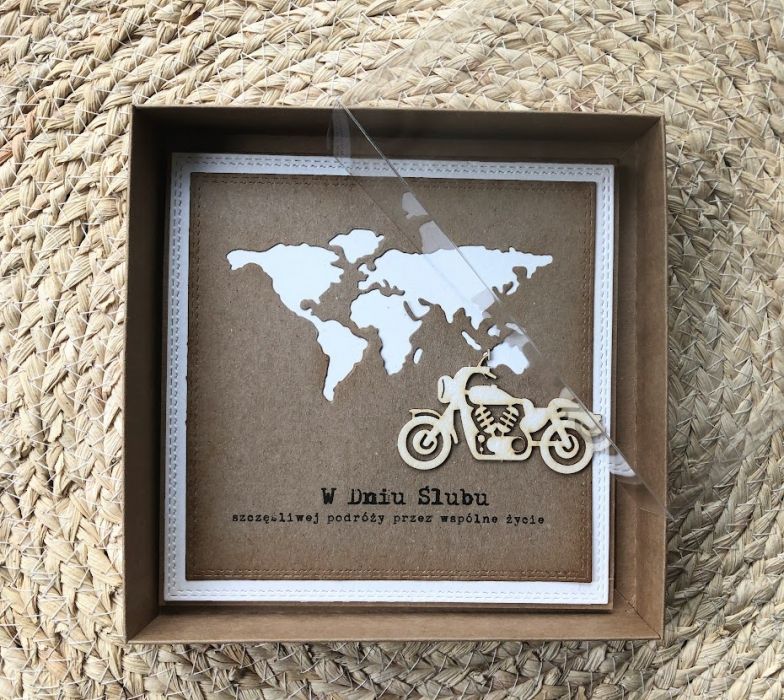 Kartka z okazji Ślubu w dopasowanym stylistycznie pudełku dla Młodej Pary , która kocha podróże i wybiera się w szczęśliwą podróż przez wspólne życie z urokliwym motorem. Komplet stworzony na bazie papieru kraftowego nadając kompletowi klimat eco z dodatkiem złamanej bieli.. Kartka ma wymiary 14,0 x 14,0 , pudełko ma wymiary 15,0 x 15,0. Całość obwiązana sznurkiem z tagiem - biletem .W środku kartki znajduje się miejsce na wypisanie własnych życzeń oraz umieszczono kieszonkę na małe co nieco lub kupon lotto . W tej postaci produkt dostępny od ręki .