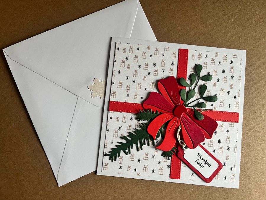 Wymiary kartkek: 15 cm x 15 cm.Koperty 16x16cm przyozdobioną świątecznym elementem