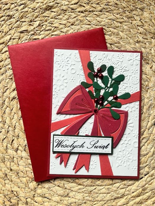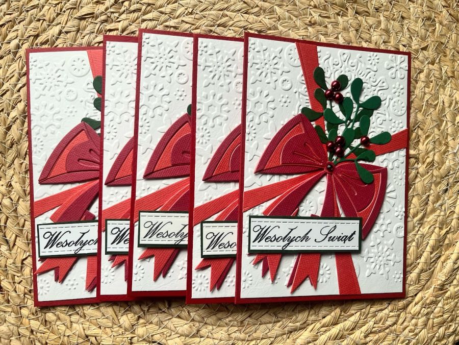 RĘCZNIE WYKONANE KARTKI TECHNIKĄ SCRAPBOOKINGU w klimacie Świąt Bożego Narodzenia z napisem – Wesołych świąt.Komplet pięciu kartek na czerwonrj bazie z czerwonymi kopertami.