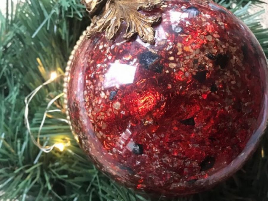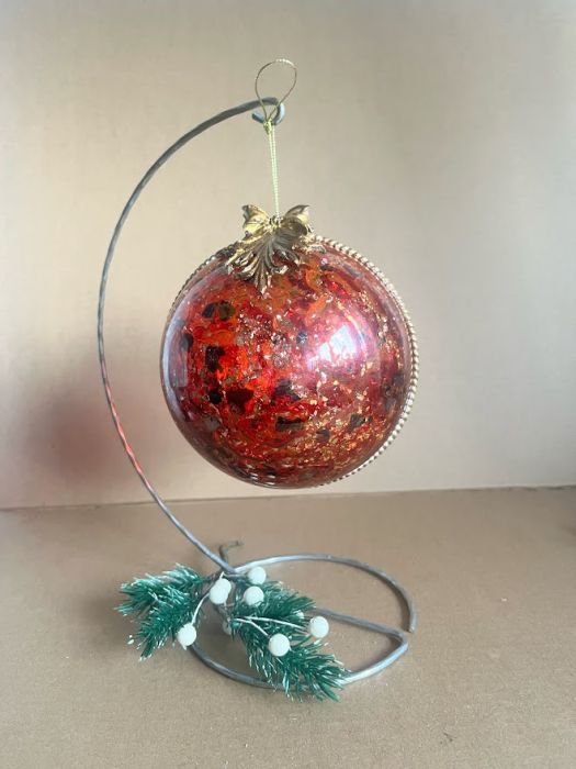 Oryginalna i bardzo efektowna bombka w imitacji bursztynu .Wykonane na kuli akrylowej o śr. 12 cm. Przyozdobione elementami sztukaterii w kolorze starego złota. To propozycja dla osób, które lubią nietypowe ozdoby świąteczne. Wykonana jest w technice mixmedia, która pozwala na uzyskanie naprawdę ciekawych efektów dekoracyjnych. Bombkę możesz wykorzystać do powieszenia w oknie. Dobrze będzie prezentować się ona również na wigilijnym stole ponieważ do bombki dołączono stojak. W tej postaci produkt gotowy do natychmiastowej wysyłki.
