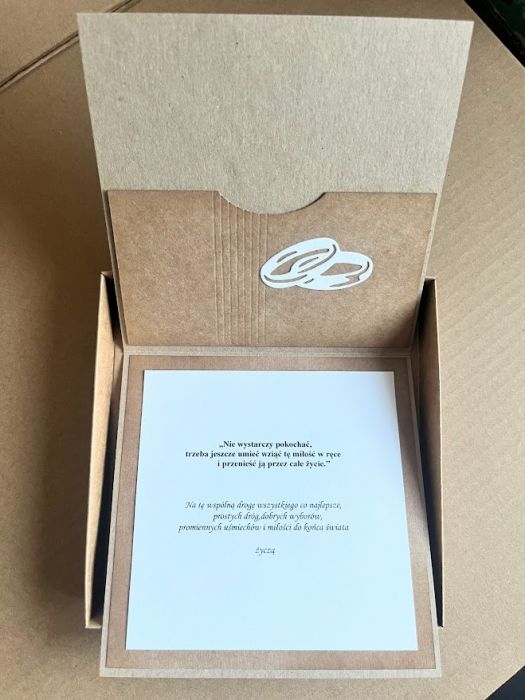Kartka z okazji Ślubu w dopasowanym stylistycznie pudełku z przeźroczystym wieczkiem dla Młodej Pary . Komplet stworzony na bazie papieru kraftowego nadając kompletowi klimat eco. Kartka ma wymiary 14 x 14 , pudełko ma wymiary 15 x 15. Całość obwiązana sznurkiem .W środku kartki znajdują się gotowe życzenia oraz umieszczono kieszonkę na małe co nieco lub kupon lotto .Do kompletu dodano torebkę eco o wym.23x18x8cm,ozdobioną w tej samej stylizacji co kartka.Na torebce umieszczono cytat-Najpiękniejsze jest toco przed Wami,co Wam przyjdzie dopiero przeżyć. Komplet do natychmiastowej wysyłki.
