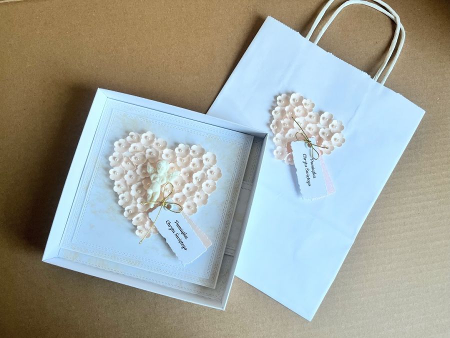 Kartka wykonana metodą scrapbookingu z najwyższej jakości materiałów.Kartka warstwowa z urokliwym sercem stworzonym z kwiatów, ręcznie stworzonych. Wykonane na białej bazie w z dodatkiem złotego i moreli . Wielkość kartki to 14 x 14 ,a pudełka z transparentnym wieczkiem to 15 x 15. Do kompletu dołączono białą torebkę ma wym. 21x18x8. Wewnątrz pudełka umieszczono kieszonkę na małe co nieco a wewnątrz kartki umieszczono gotowe życzenia. Jest możliwość dodania imienia Dziecka .Podczas zamówienia w uwagach proszę wpisać imię.