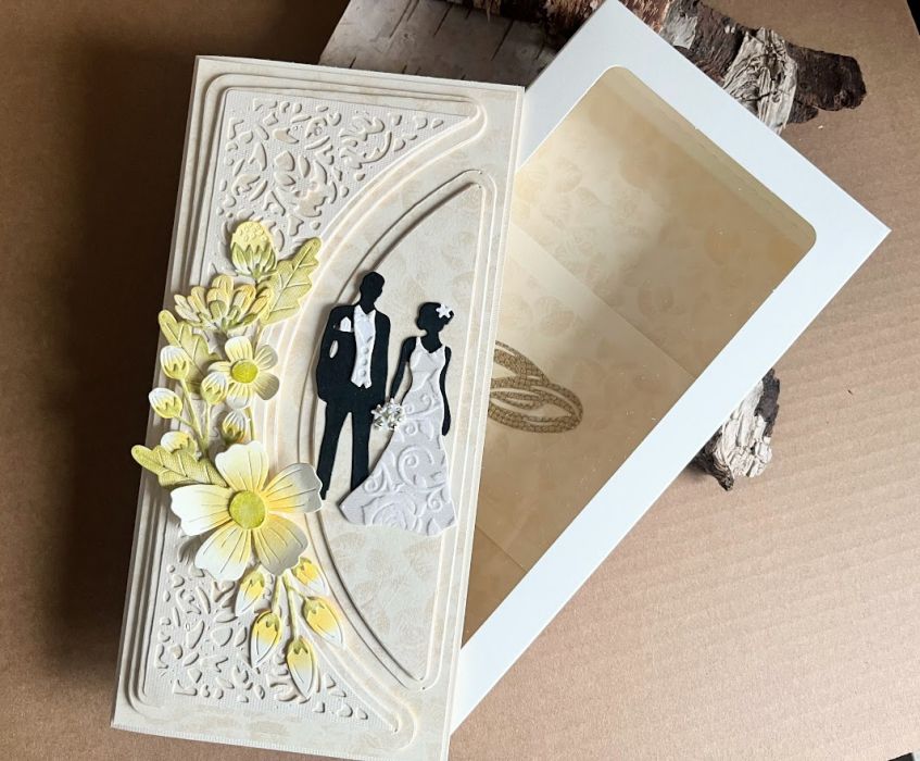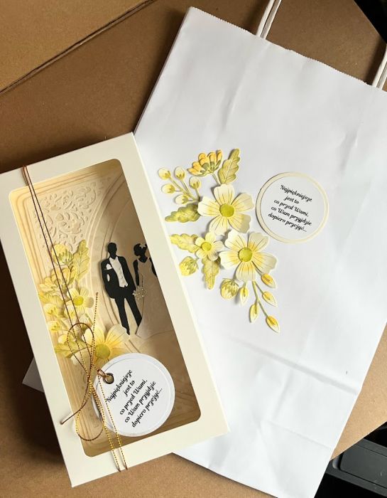Elegancka, bogato zdobiona kartka w pudełku z okazji ślubu. Utrzymana w delikatnej kolorystyce bieli ,kremu i złota.ozdobiona postaciami młodej pary oraz kwiatami. Kartka jest w całości wykonana ręcznie z najlepszej jakości materiałów do scrapbookingu. Wielkość pudełka z okienkiem 22x11x3,5cm, Wielkość kartki 21×10,5cm z gotowymi życzeniami do własnoręcznego podpisu.Na dnie pudełka umieszczono kieszonkę na małe co nieco.Do kompletu dodano białą torebkę która jest ozdobiona w tej samej stylizacji co kartka. Wielkość torebki 32,5x23,5x10cm.W tej postaci komplet dostępny od ręki.