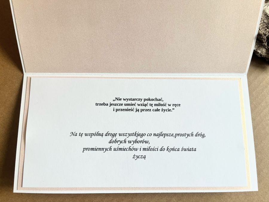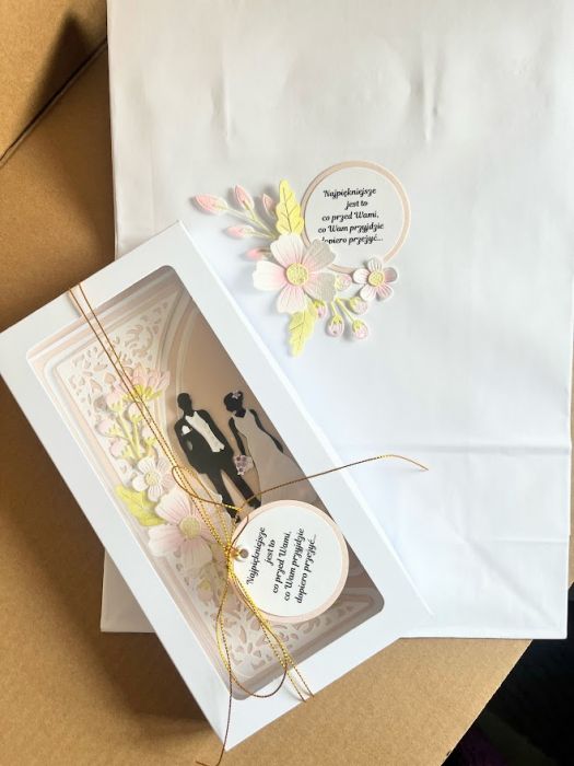 Elegancka, bogato zdobiona kartka w pudełku z okazji ślubu. Utrzymana w delikatnej kolorystyce bieli i metalicznego różowego złota.Ozdobiona postaciami młodej pary oraz kwiatami. Kartka jest w całości wykonana ręcznie z najlepszej jakości materiałów do scrapbookingu. Wielkość pudełka z okienkiem 22x11x3,5cm, Wielkość kartki 21×10,5cm z gotowymi życzeniami do własnoręcznego podpisu.Na dnie pudełka umieszczono kieszonkę na małe co nieco.Do kompletu dodano białą torebkę która jest ozdobiona w tej samej stylizacji co kartka. Wielkość torebki 32,5x23,5x10cm.W tej postaci komplet dostępny od ręki.