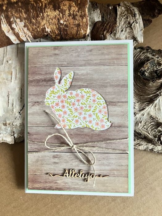 Zestaw pięciu kartek wielkanocnych z zajączkiem i napisem Alleluja. Kartki powstały na białej bazie. Do karzdej kartki dołączono białą kopertę. Wymiar kartki 10,5x14,5cm a koperty 11,5x16 cm.Wewnątrz z karzdej z kartek jest miejsce na zamieszczenie własnych życzeń. Komplet do natychmiastowej wysyłki.