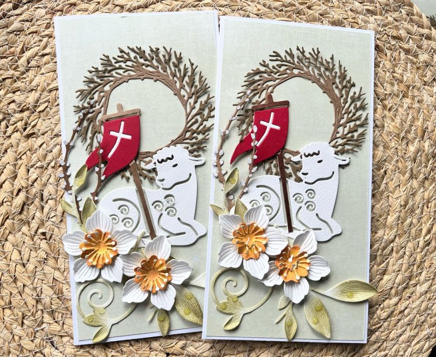Zestaw dwóch kartek wielkanocnych z barankiem. Kartki wykonane na białej bazie .Przewodnim motywem jest baranek na tle gałązkowego wianka i bazi oraz ręcznie robione żonkile. Wielkość kartki to 10,5x21cm. Do kartki dołączono białą kopertę o wym 11x22 cm.