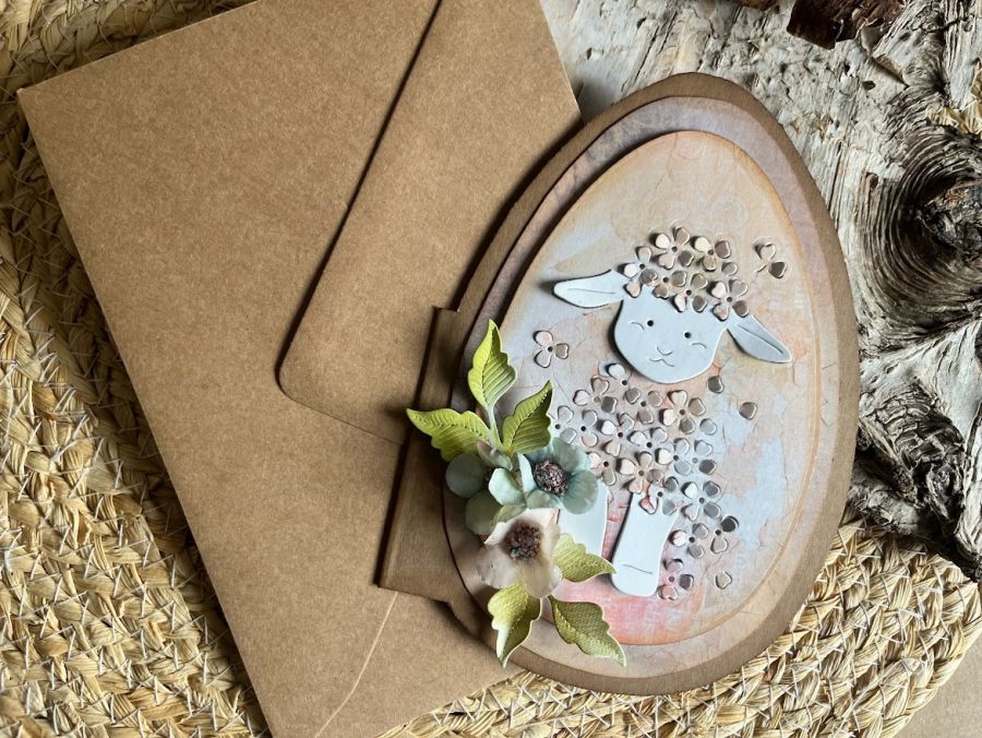 Wyjątkowa, oryginalna kartka w kształcie pisanki, na życzenia z okazji Świąt Wielkanocnych. Wykonana z bezkwasowych papierów do scrapbookingu,Ozdobiona barankiem i kwiatami.Całość warstwowa dając efekt 3D. Kartka otwierana, wewnątrz miejsce na wpisanie życzeń.