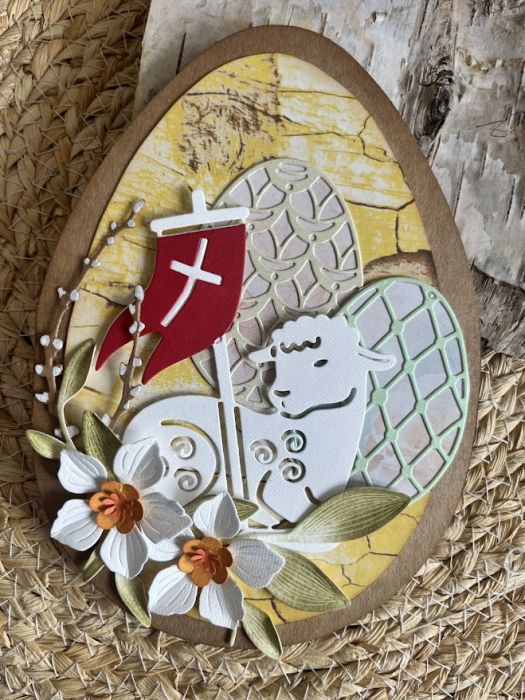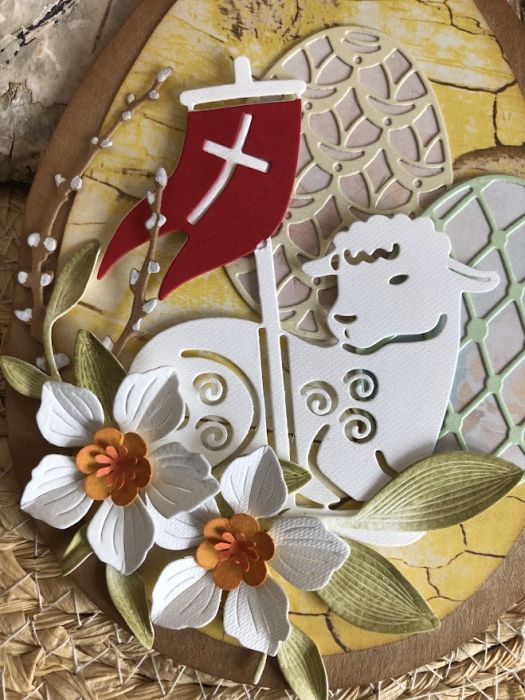Wyjątkowa, oryginalna kartka w kształcie pisanki, na życzenia z okazji Świąt Wielkanocnych. Wykonana z bezkwasowych papierów do scrapbookingu,Ozdobiona barankiem i kwiatami.Całość warstwowa dając efekt 3D. Kartka otwierana, wewnątrz miejsce na wpisanie życzeń.