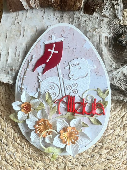 Wyjątkowa, oryginalna kartka w kształcie pisanki, na życzenia z okazji Świąt Wielkanocnych. Wykonana z bezkwasowych papierów do scrapbookingu,Ozdobiona barankiem i kwiatami.Całość warstwowa dając efekt 3D. Kartka otwierana, wewnątrz miejsce na wpisanie życzeń.
