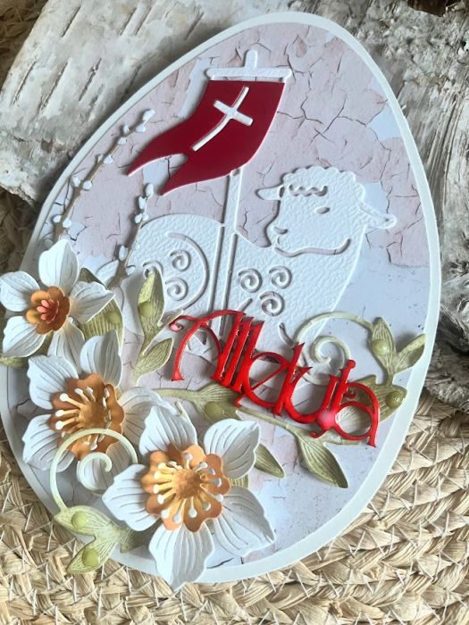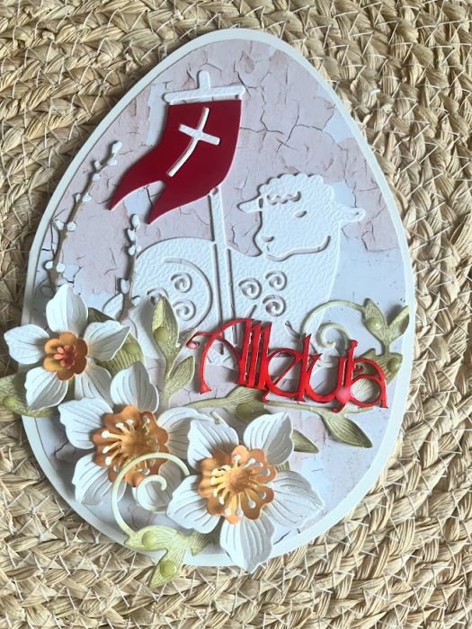 Wyjątkowa, oryginalna kartka w kształcie pisanki, na życzenia z okazji Świąt Wielkanocnych. Wykonana z bezkwasowych papierów do scrapbookingu,Ozdobiona barankiem i kwiatami.Całość warstwowa dając efekt 3D. Kartka otwierana, wewnątrz miejsce na wpisanie życzeń.